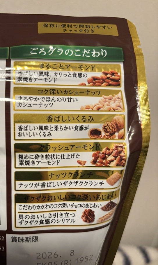 三種類のナッツとナッツクランチは、ころグラチョコナッツにとって単なる具材ではなく、食べ応えと印象を決定づける中心的な要素です。シリアルの中に埋もれることなく、しっかりと存在感を放つことで、噛む楽しさと香ばしさを両立させています。