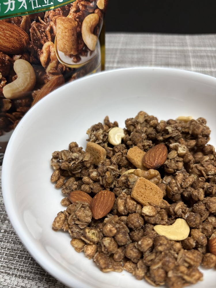 カカオ風味のシリアルは、チョコレートの甘さを前面に出しすぎず、香ばしさを感じさせる設計になっています。そのため、噛んだときに重たさが残らず、後味も比較的すっきりしています。この軽快さがあるからこそ、後から加わるナッツの存在感をしっかり受け止める土台として機能しており、全体のバランスが崩れません。